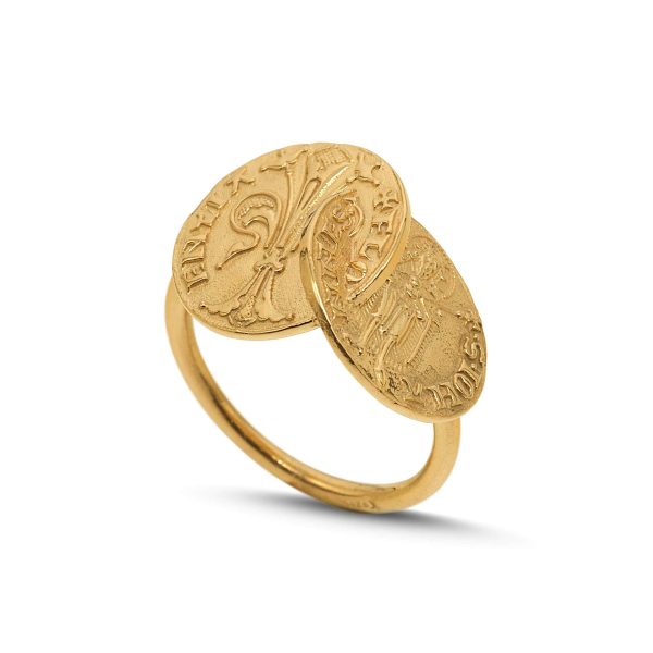 Scopri l’eleganza senza tempo dell’Anello Doppio Fiorino Fiorentino, realizzato artigianalmente in Argento 925 brunito e Argento 925 placcato Oro 18 kt con la storica tecnica della cera persa.