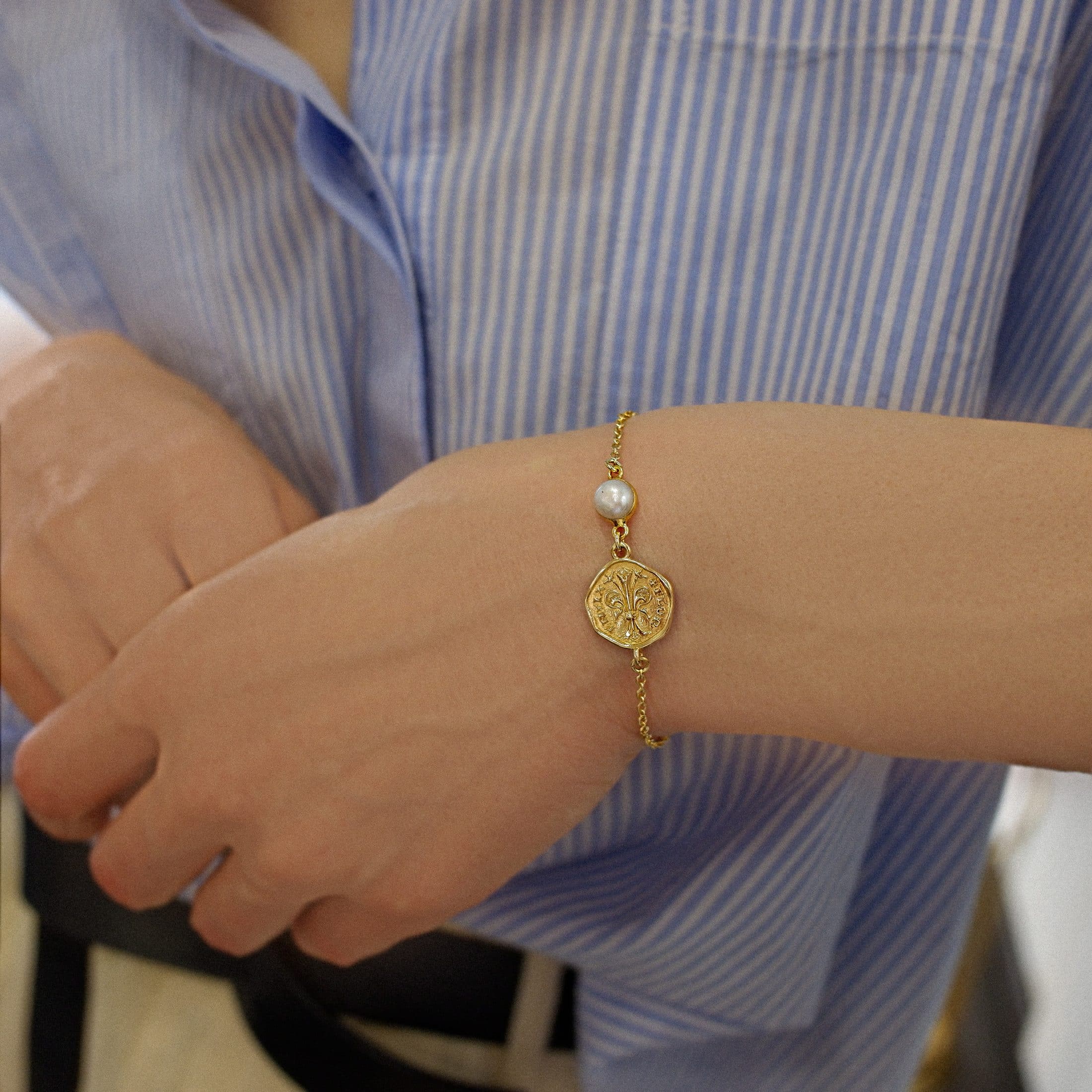 Il design combina la storica icona del fiorino con delicatezza delle perla di fiume, creando un contrasto affascinante e armonioso. Le perle di fiume sono note per la loro lucentezza e la delicate sfumature, rendendo ogni pezzo unico.