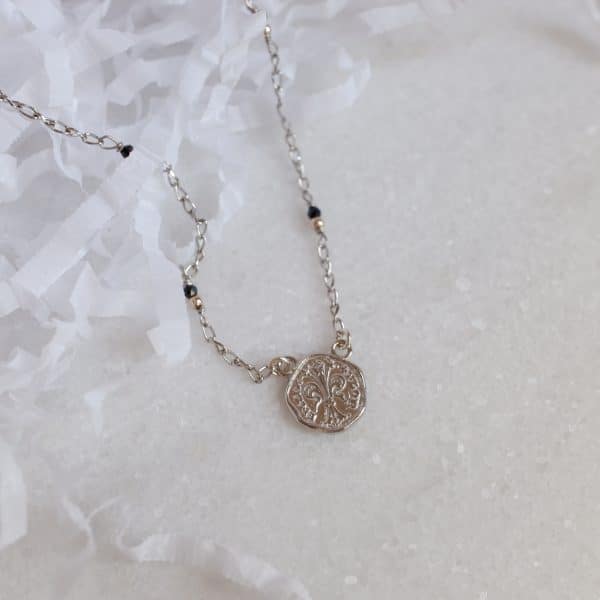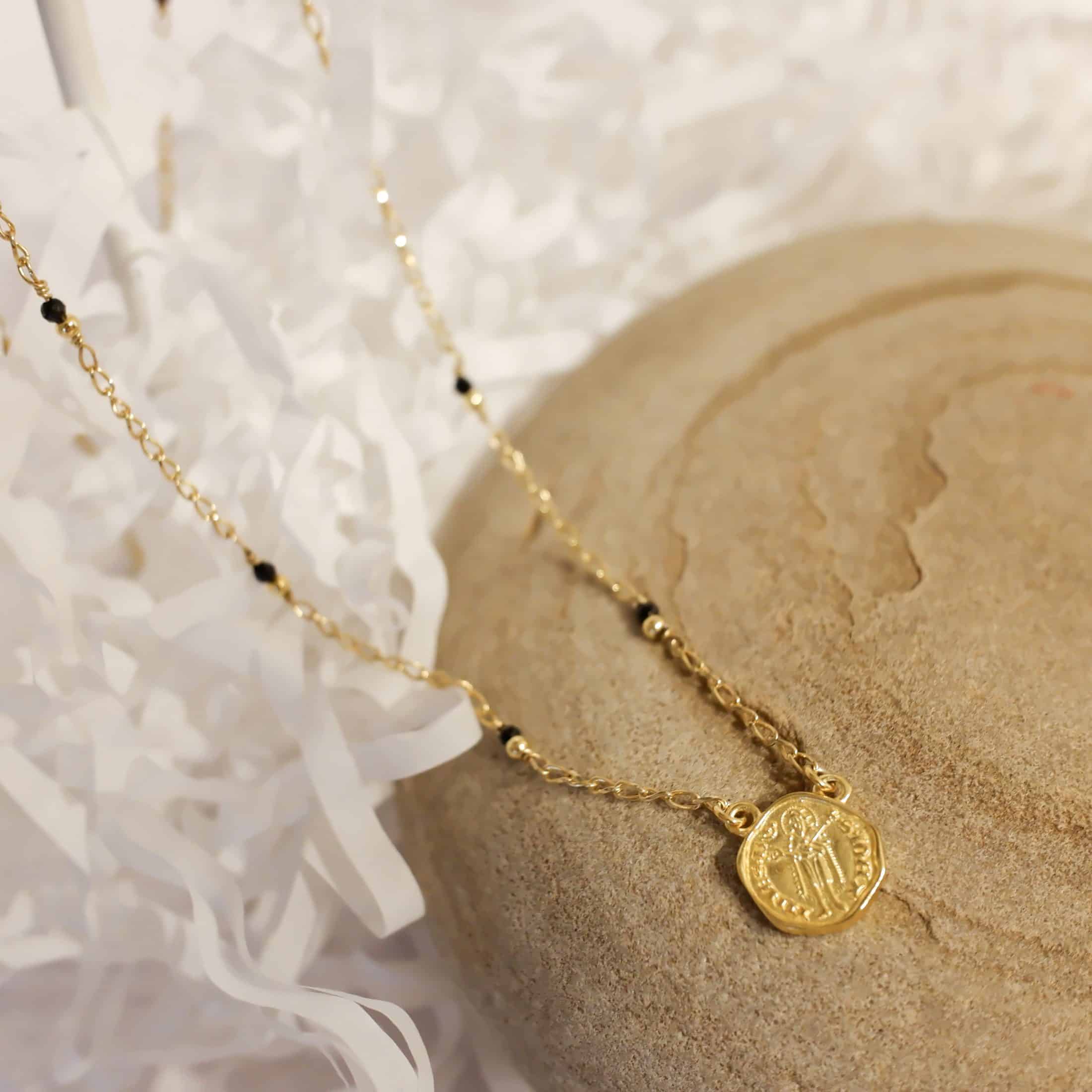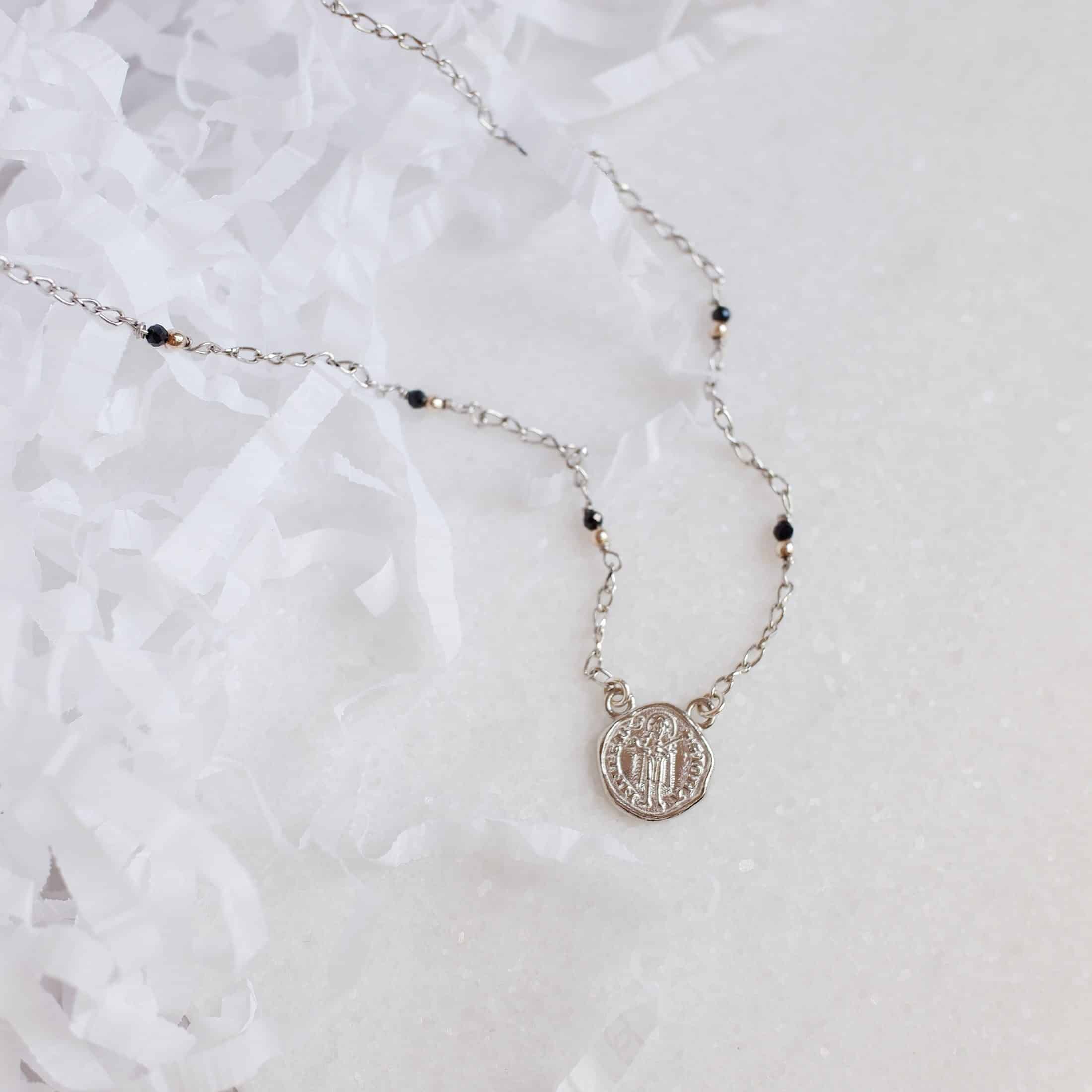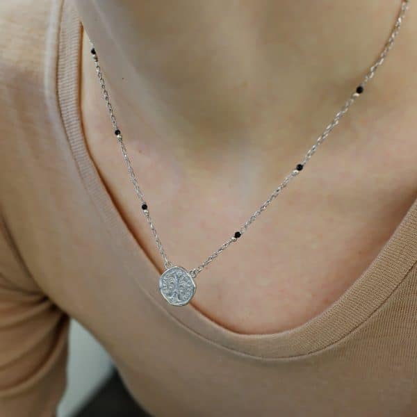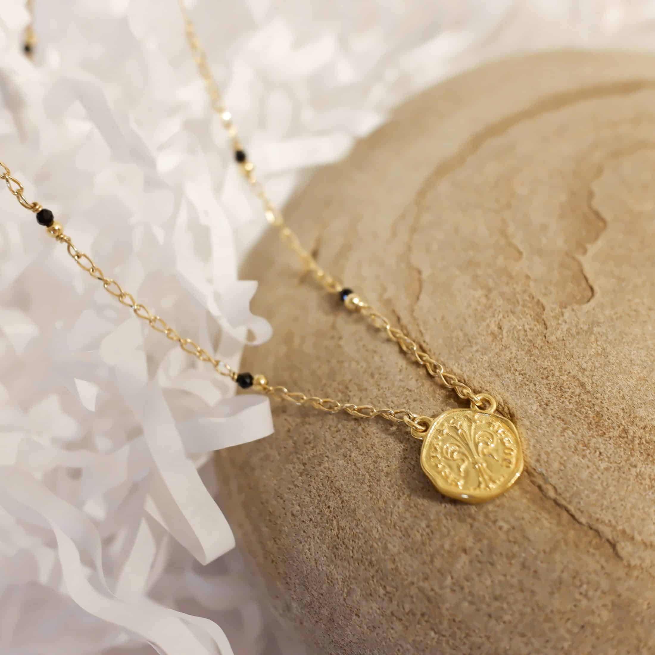 La collana con moneta Fiorino e spinello nero è un gioiello che unisce la ricchezza storica di Firenze con l’eleganza moderna. La moneta Fiorino è finemente lavorata per catturare ogni dettaglio del giglio fiorentino e delle iscrizioni storiche. Il giglio, simbolo di ricchezza e potere nella Firenze medievale, è rappresentato con precisione e cura, evocando l’importanza culturale della moneta. La collana è decorata con pietre di spinello nero, note per la loro lucentezza profonda, distribuite lungo una catena con palline.