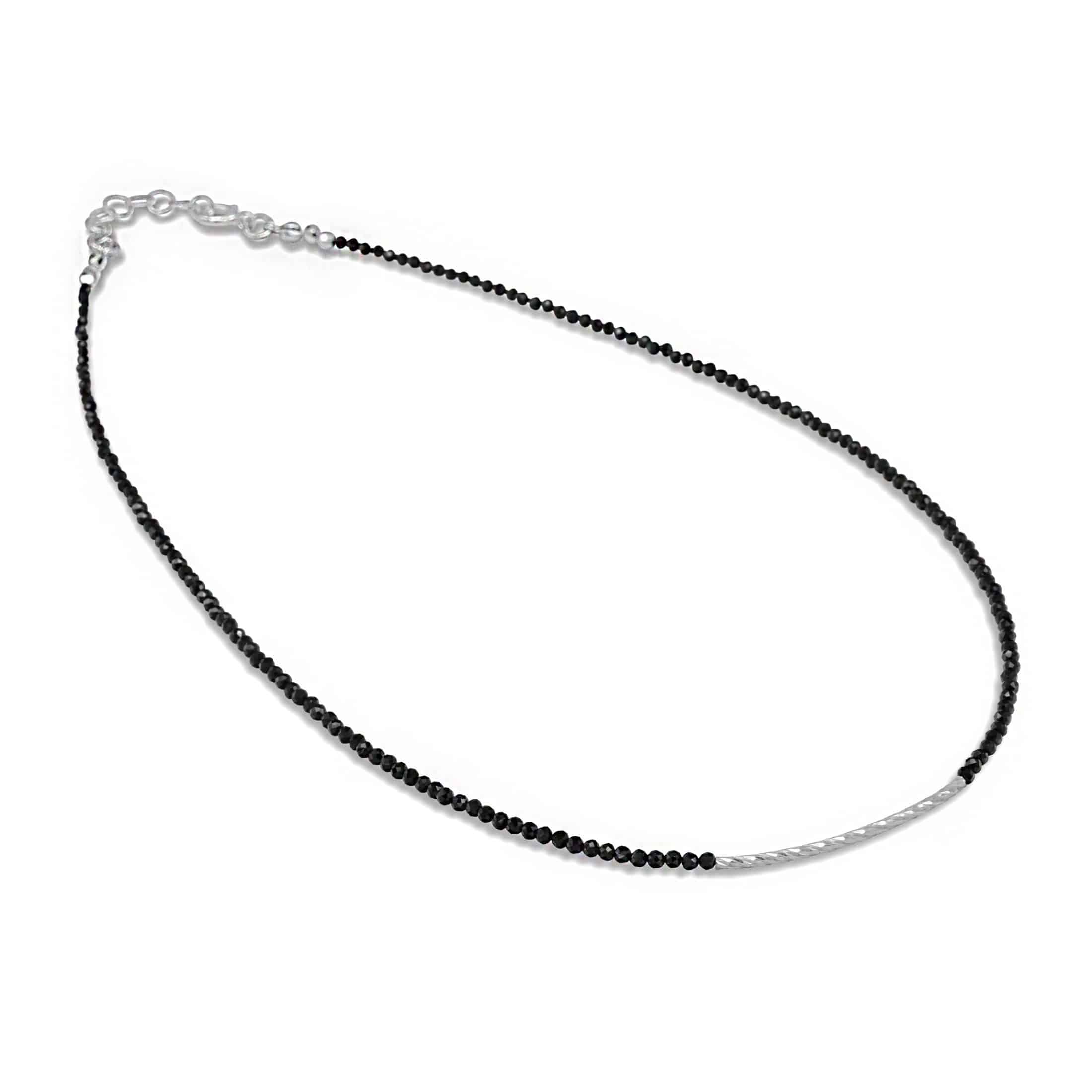 Il girocollo con spinello sfaccettato nero e barra a spirale in argento è un gioiello che unisce la sofisticatezza delle pietre semipreziose con l’innovazione del design moderno.