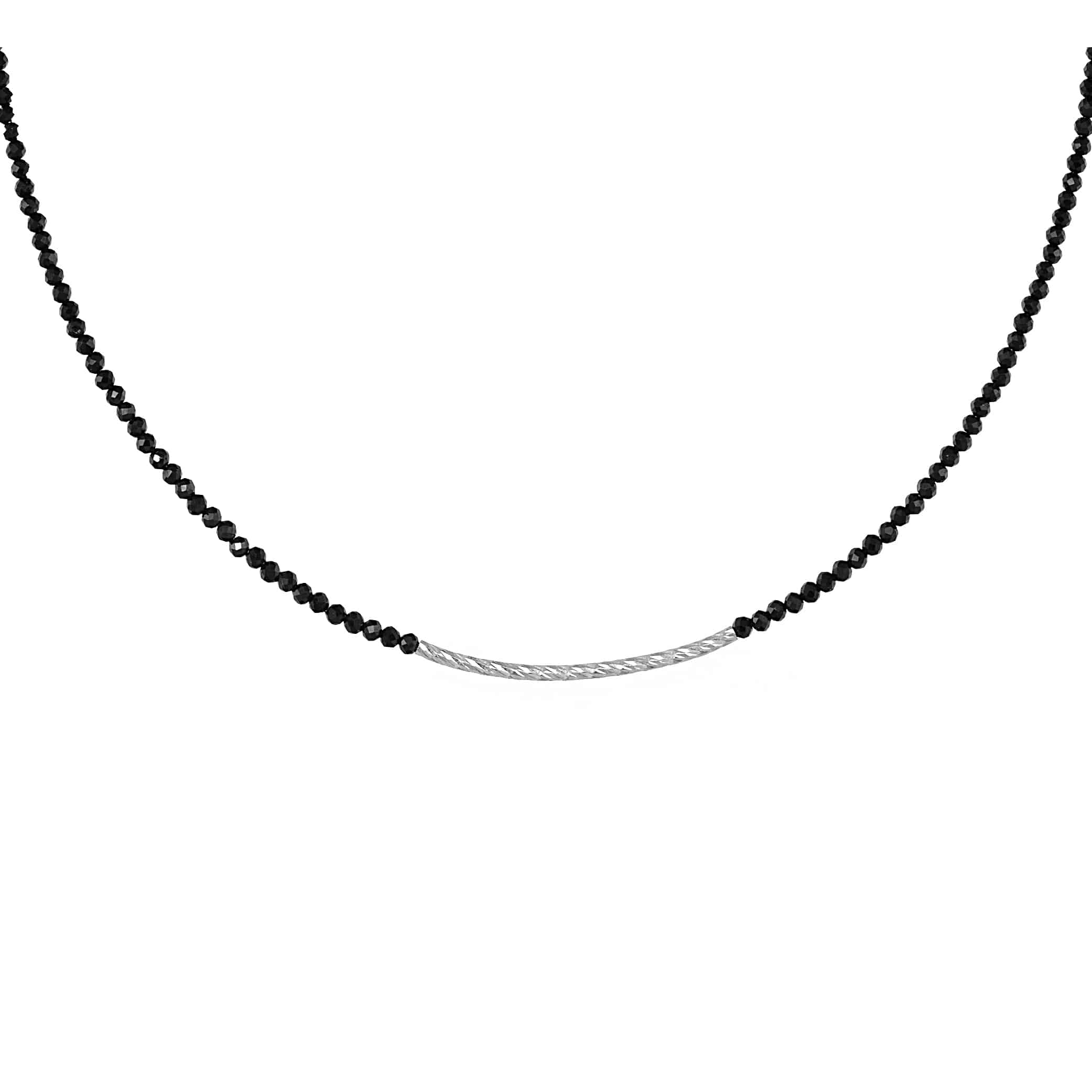 Le perle di spinello nero selezionate per la loro lucentezza intensa e la loro capacità di catturare e riflettere la luce. Ogni perla è finemente sfaccettata, creando un effetto scintillante che conferisce un’eleganza sofisticata al girocollo. La barra a spirale in argento 925 è il punto focale del design, aggiungendo un elemento contemporaneo e dinamico al gioiello.