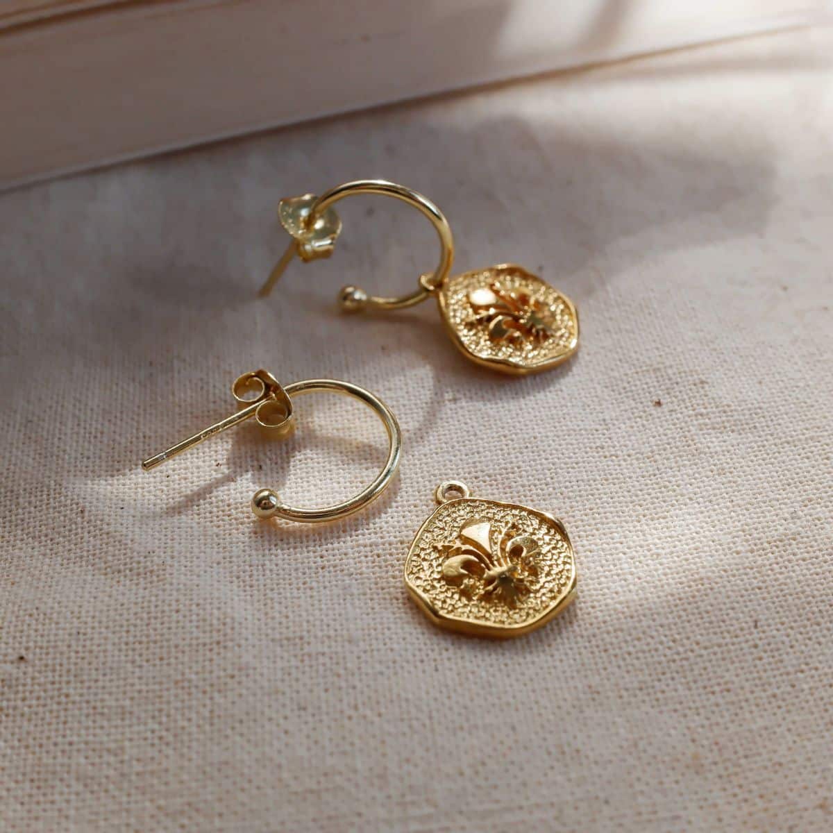 Orecchini a semicerchio in argento 925 placcato oro 18 kt con pendente rimovibile realizzato con la tecnica della cera persa, raffigurante il Giglio Fiorentino, simbolo storico di Firenze.