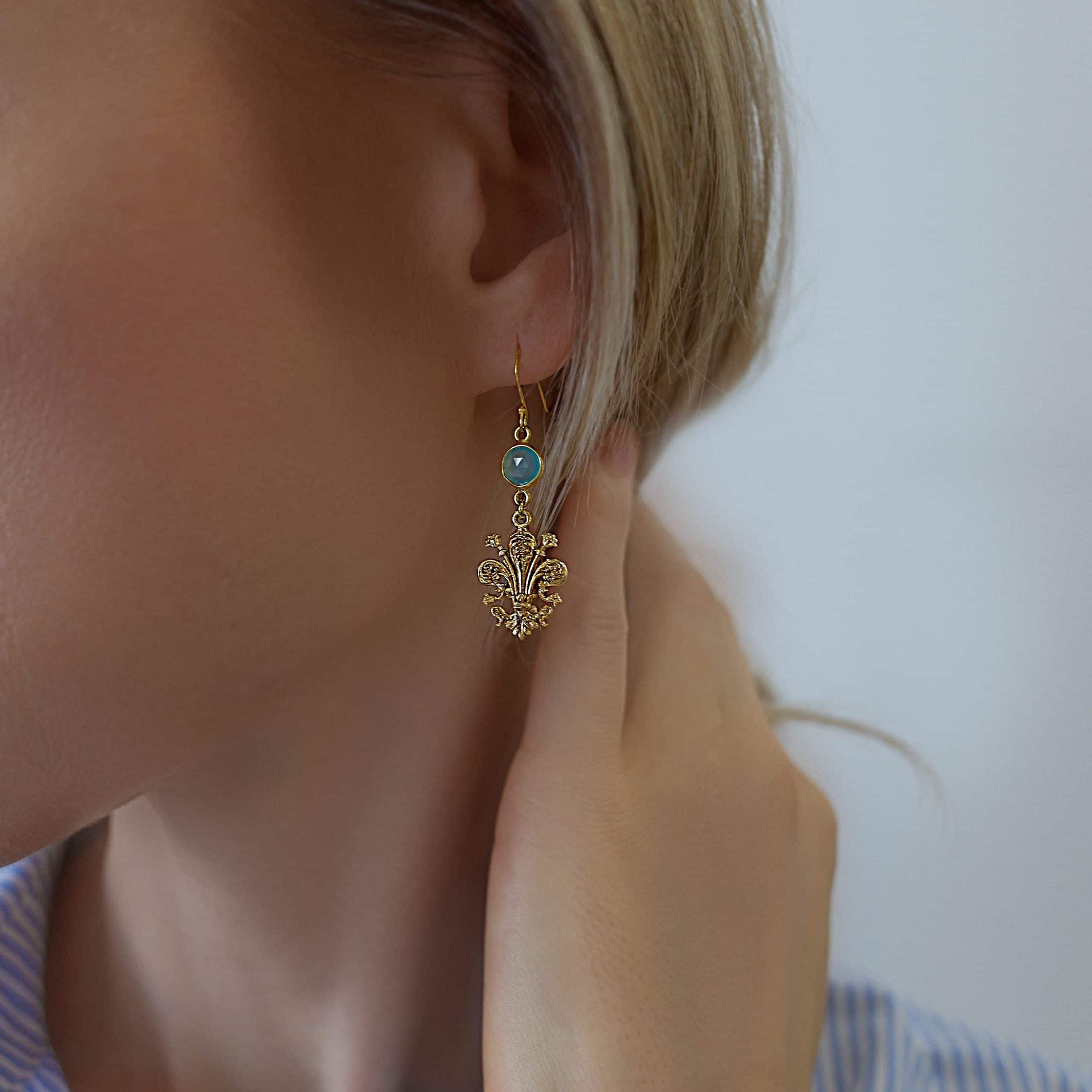 I nostri orecchini pendenti con giglio antico fiorentino e calcedonio acqua sono perfetti come regalo per una persona speciale o come preziosa aggiunta alla propria collezione di gioielli, un equilibrio tra stile, eleganza e artigianalità di alta qualità.