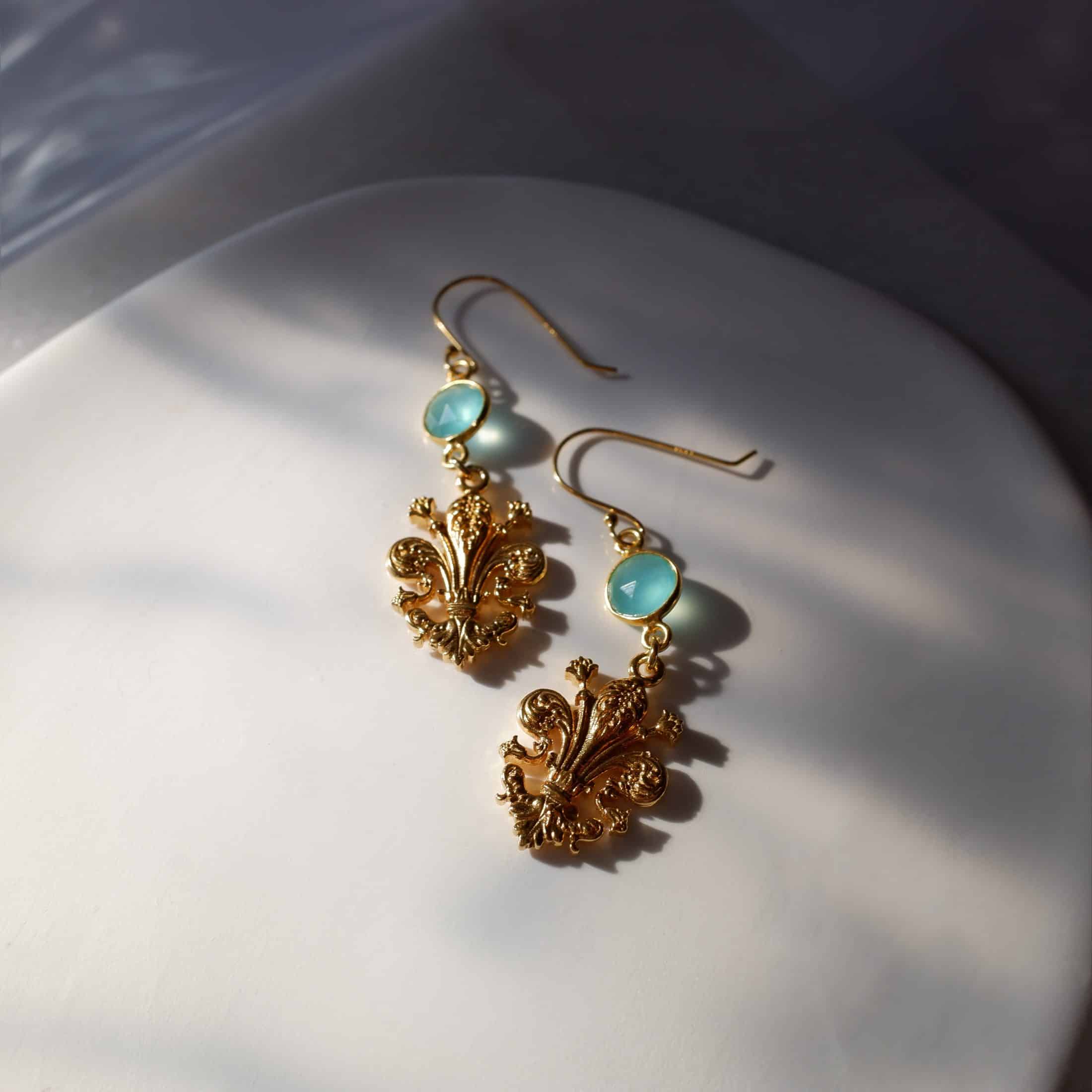 Questi orecchini sono caratterizzati da un pendente a forma di giglio fiorentino, noto anche come “Fleur-de-Lis”, uno dei simboli più iconici di Firenze, confinato con una pietra di calcedonio acqua.