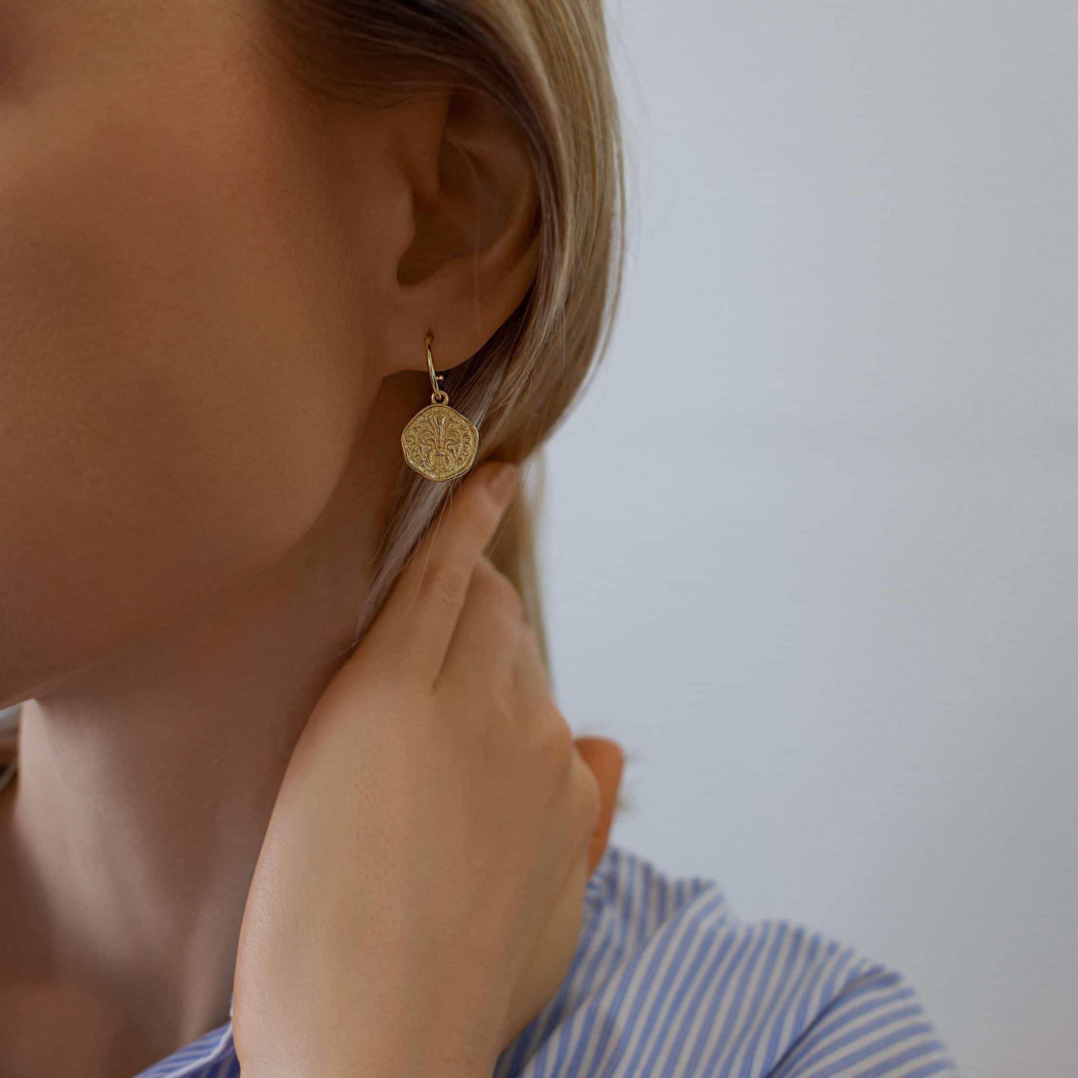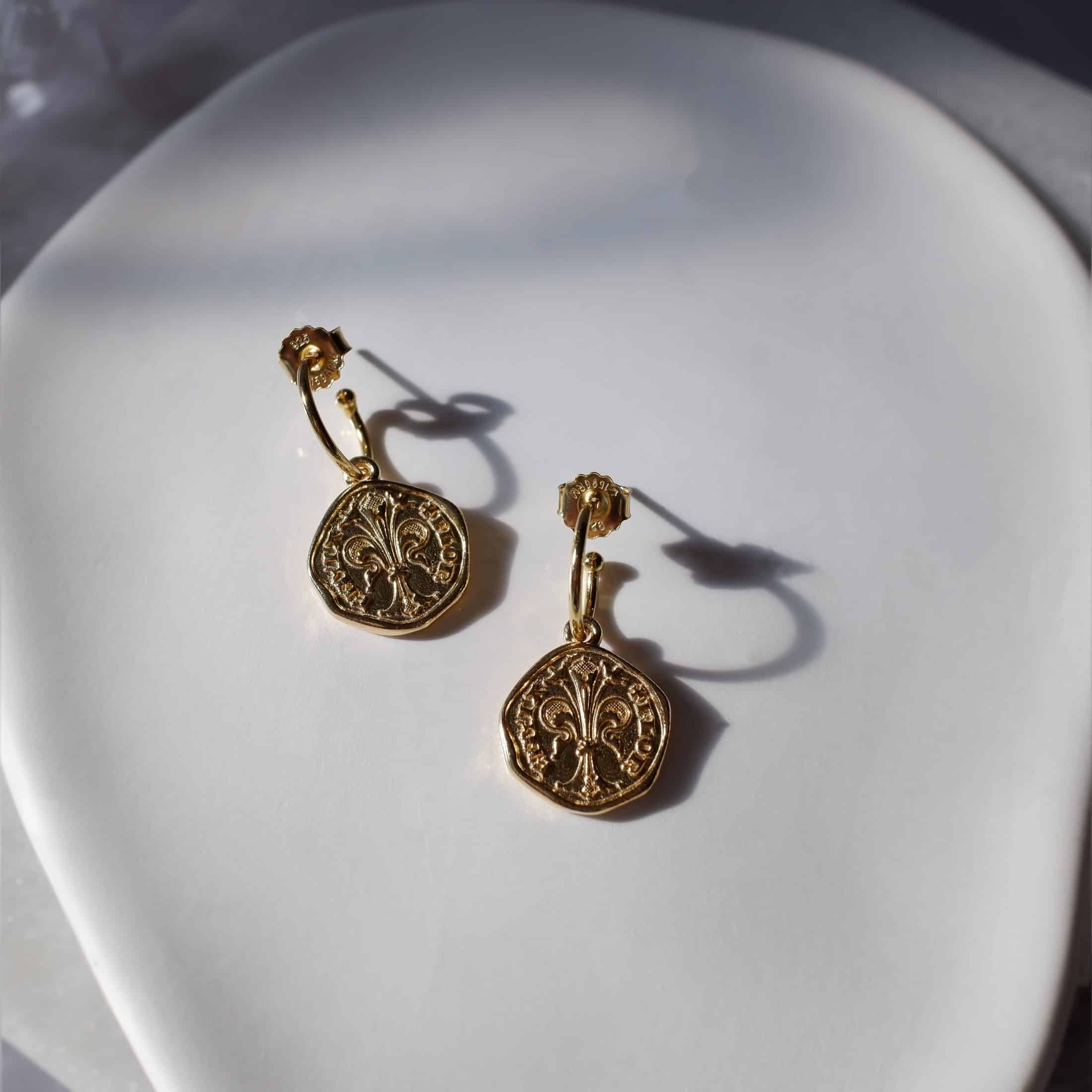 I pendenti Fiorino sono riproduzioni accurate della storica moneta fiorentina, con il caratteristico giglio fiorentino rappresentato con precisione. Entrambi i pendenti possono essere rimossi, consentendo di indossare gli orecchini con o senza di essi.
